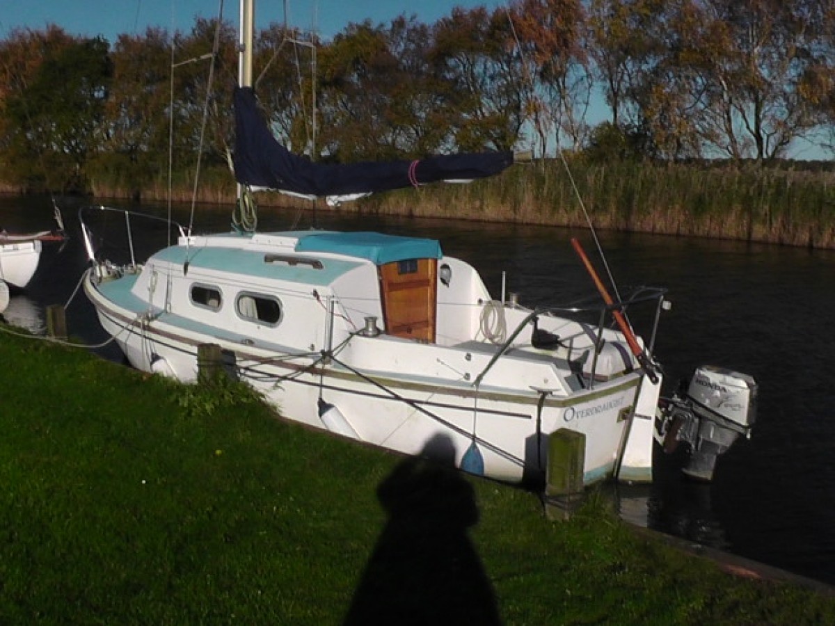 Built 1979, highly sought after small Westerly 4 berth. length 21.5' (6.55m) beam 8' (2.5m) draft 2.75' (98cm) Bilge keels, Mainsail and Genoa, anchor and mud weight, compass, echosounder, warps and fenders. Navigation lights, 12volt sockets, mains connector lead 13 amp and 16 amp connectors. Solar panel trickle charger to 110 amphour battery. Honda 9.9 hp outboard motor, electric start, 8 amp charging and remote controls. Sea Toilet,Thetford 2 burner and grill gas cooker, sink, water pump (20l). crockery, cutlery sleeping bags. New antifouling 2018. Headlining renewed 2015. SBS certificate till 2023, Broads Licence till April 2018. Lying hauled out at Martham Boats, Cess Road, Martham, Norfolk (01689 607534) to whom application to view should be addressed. Free delivery any where on the Broads.